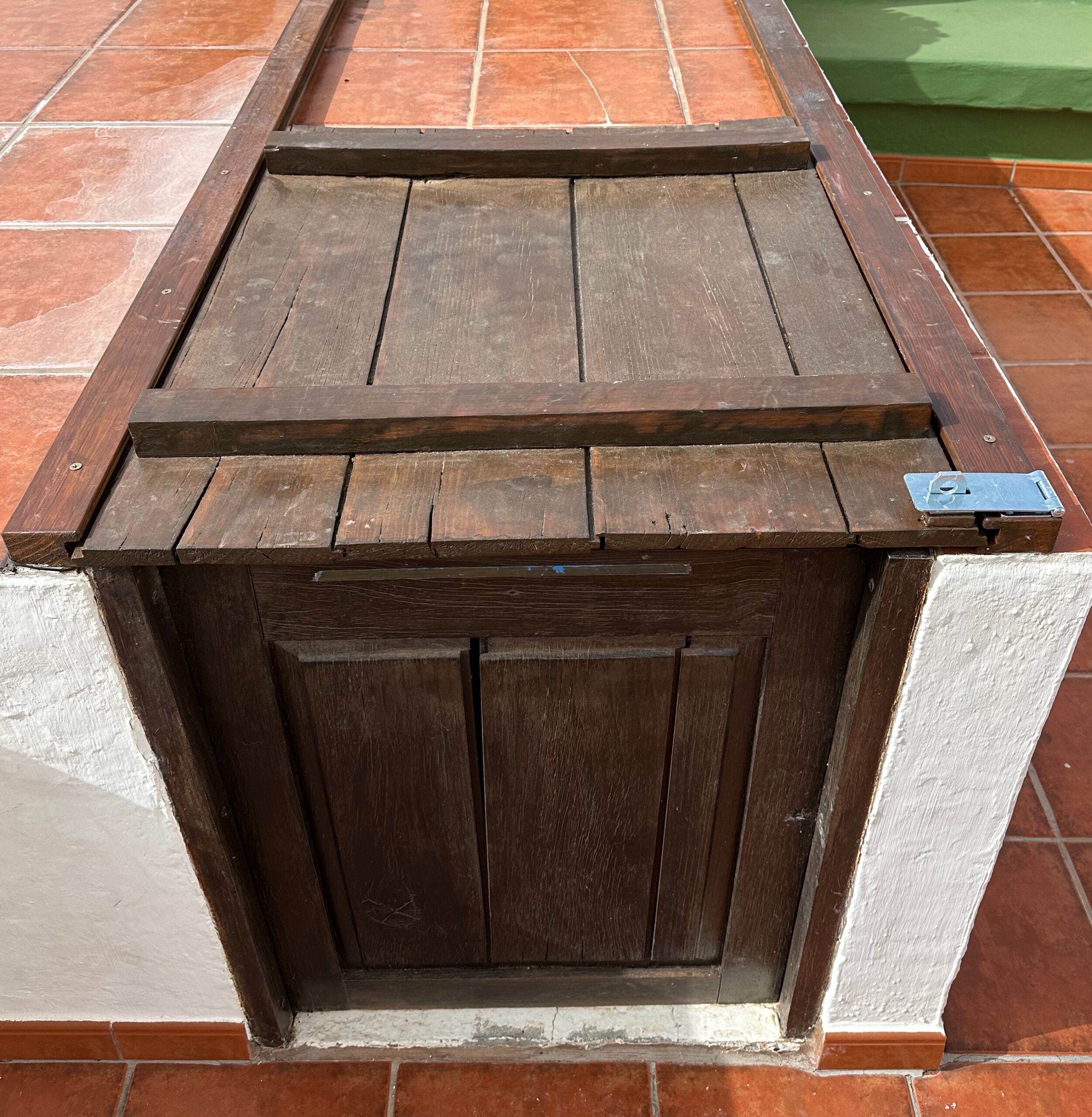 Bitte stellen Sie sich nicht auf das Picon-Beet hinter dem Grill. Darunter befindet sich ein großer Hohlraum und bei großer Belastung kann die Holzdecke brechen. Gleiches gilt für die Holzklappen zum Pumpenraum des Pools und den anderen Holzklappen zum unterirdischen Wassertank (Aljibe).