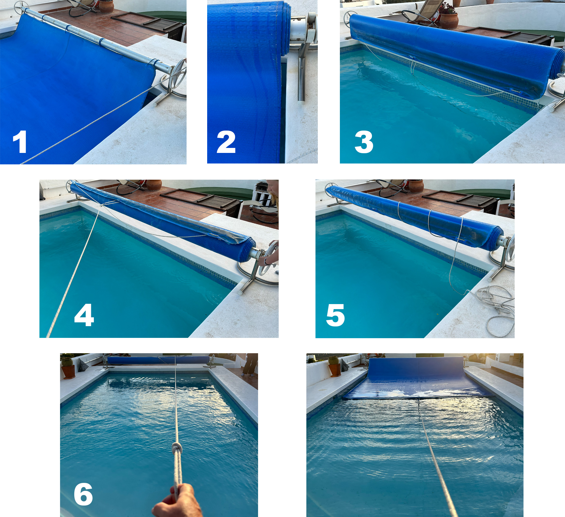 1) Take the cord to the wheel and start to roll up the cover. Make sure that the cover is straight and without kinks on the roll.