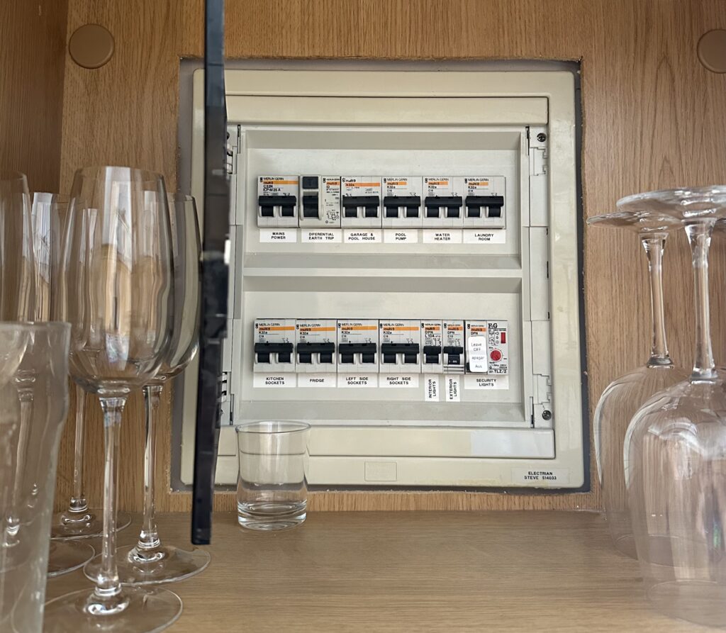 The fuse box is located in the upper compartment of the glass cupboard in the kitchen. There you can check whether all the fuses are switched on. All levers (except for the fuse at the bottom right) should be in the up position.